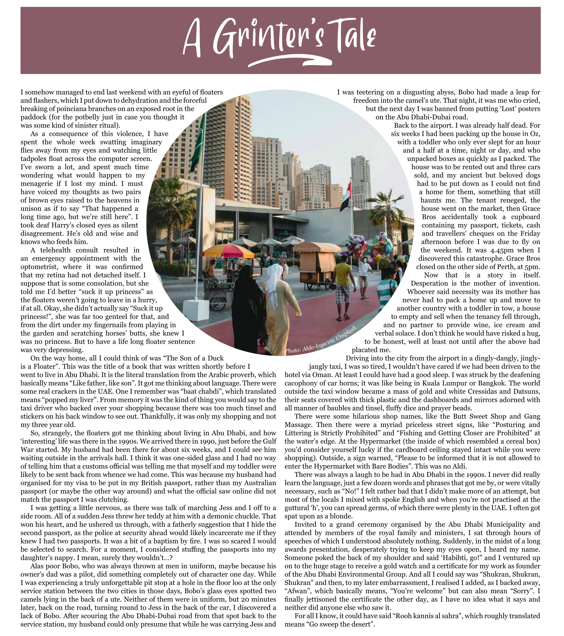 So, strangely, the floaters got me thinking about living in Abu Dhabi, and how ‘interesting’ life was there in the 1990s. We arrived there in 1990, just before the Gulf War started. My husband had been there for about six weeks, and I could see him waiting outside in the arrivals hall. I think it was one-sided glass and I had no way of telling him that a customs official was telling me that myself and my toddler were likely to be sent back from whence we had come. This was because my husband had organised for my visa to be put in my British passport, rather than my Australian passport (or maybe the other way around) and what the official saw online did not match the passport I was clutching.